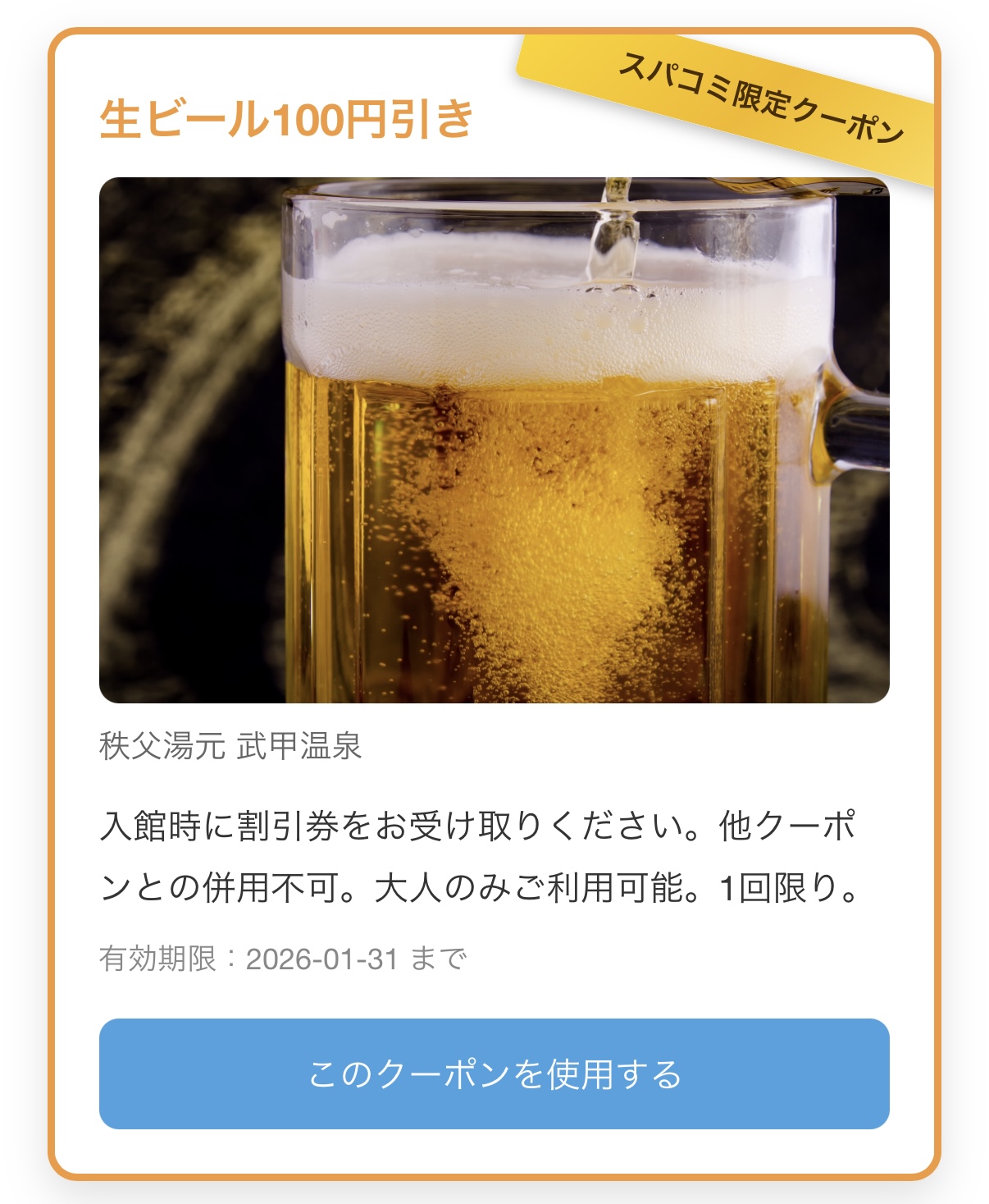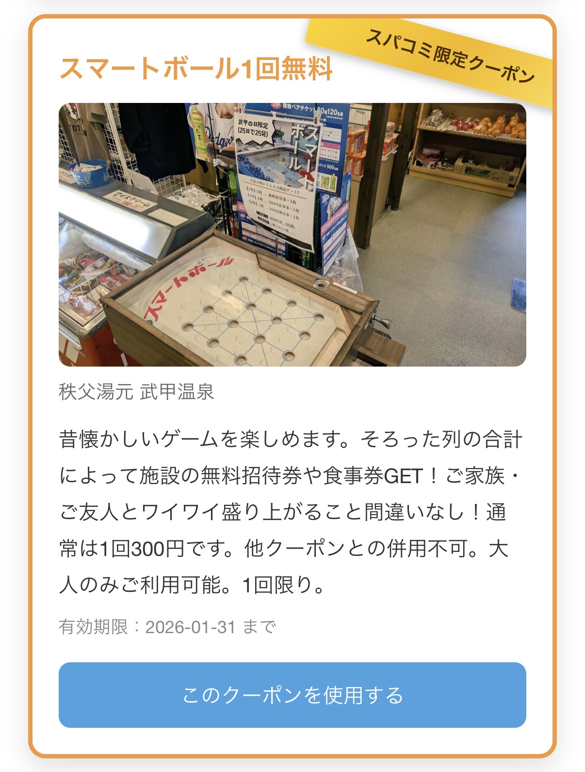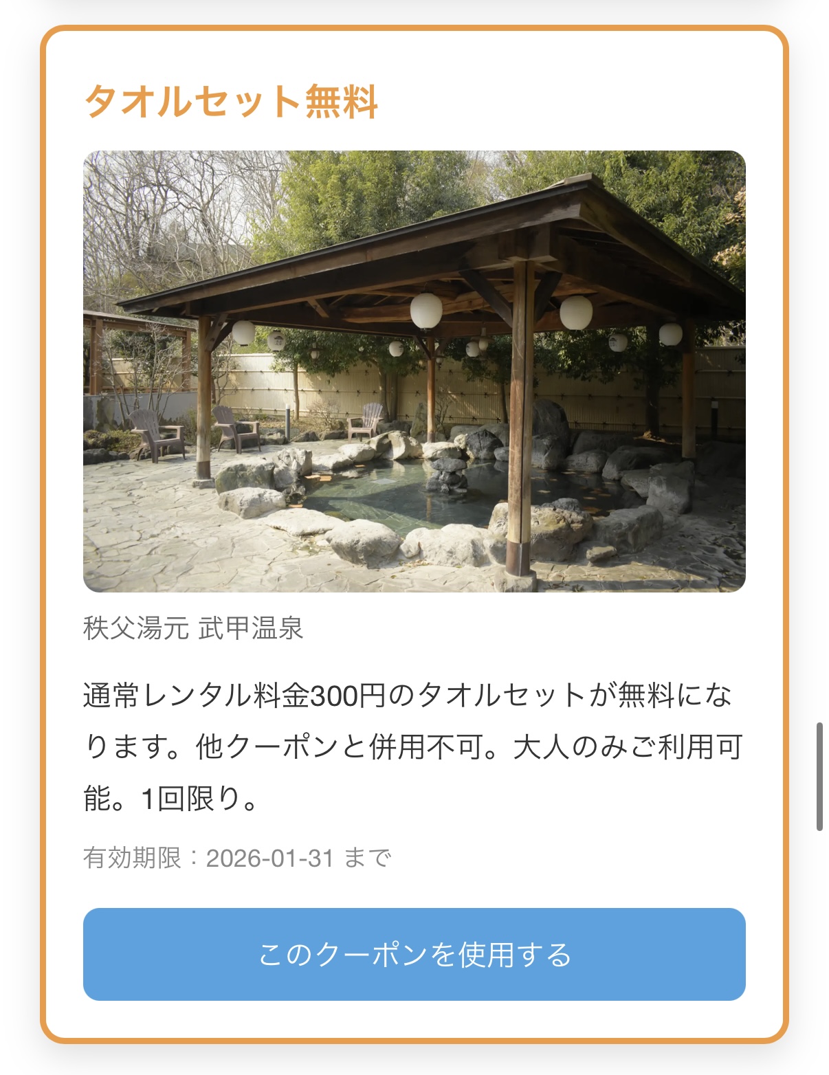 クーポンは「ログイン不要」で、入館時に画面を見せるだけで使えます。