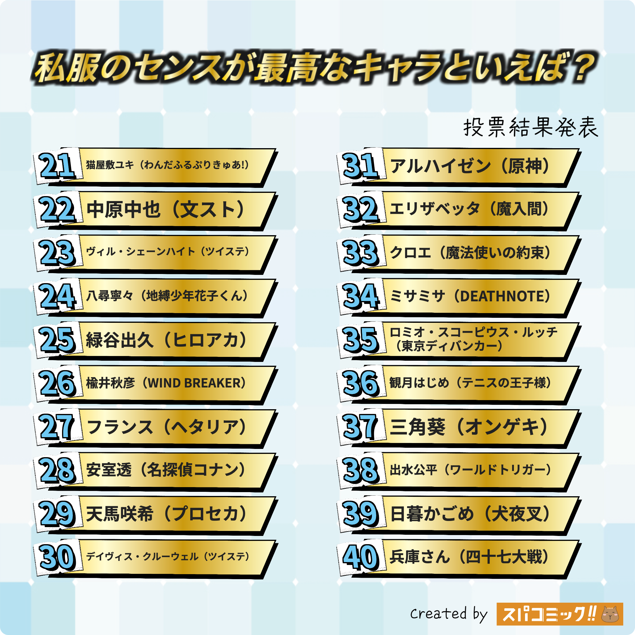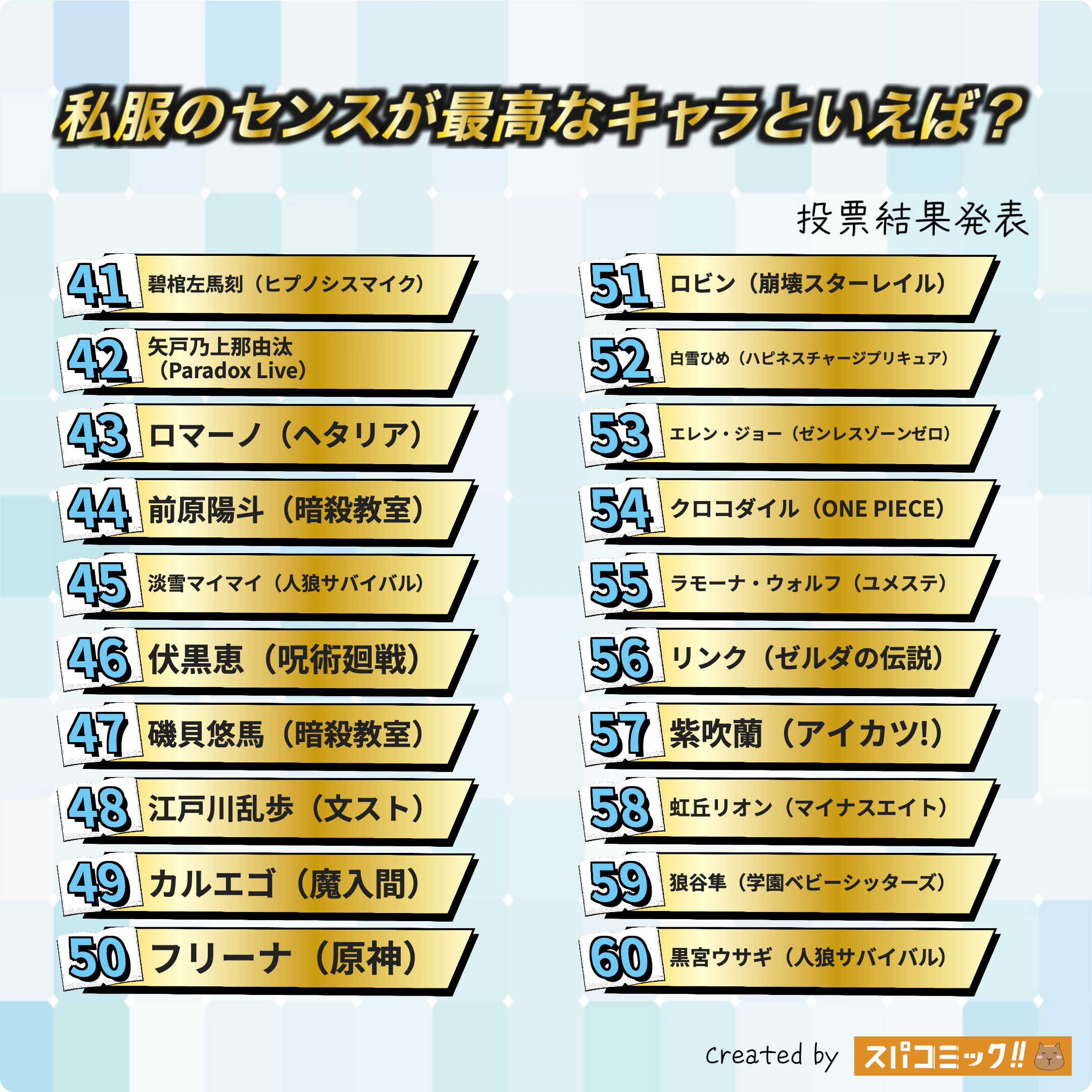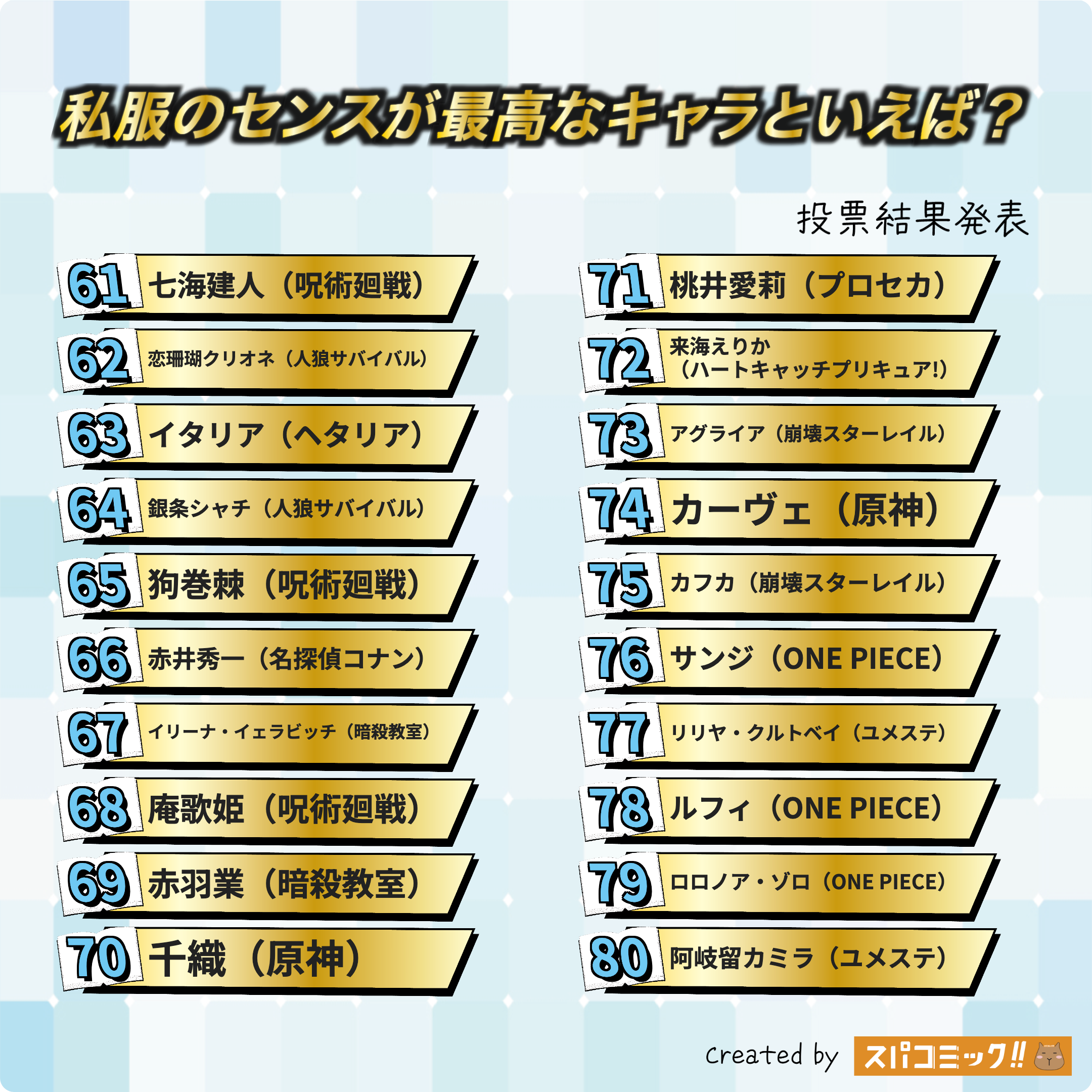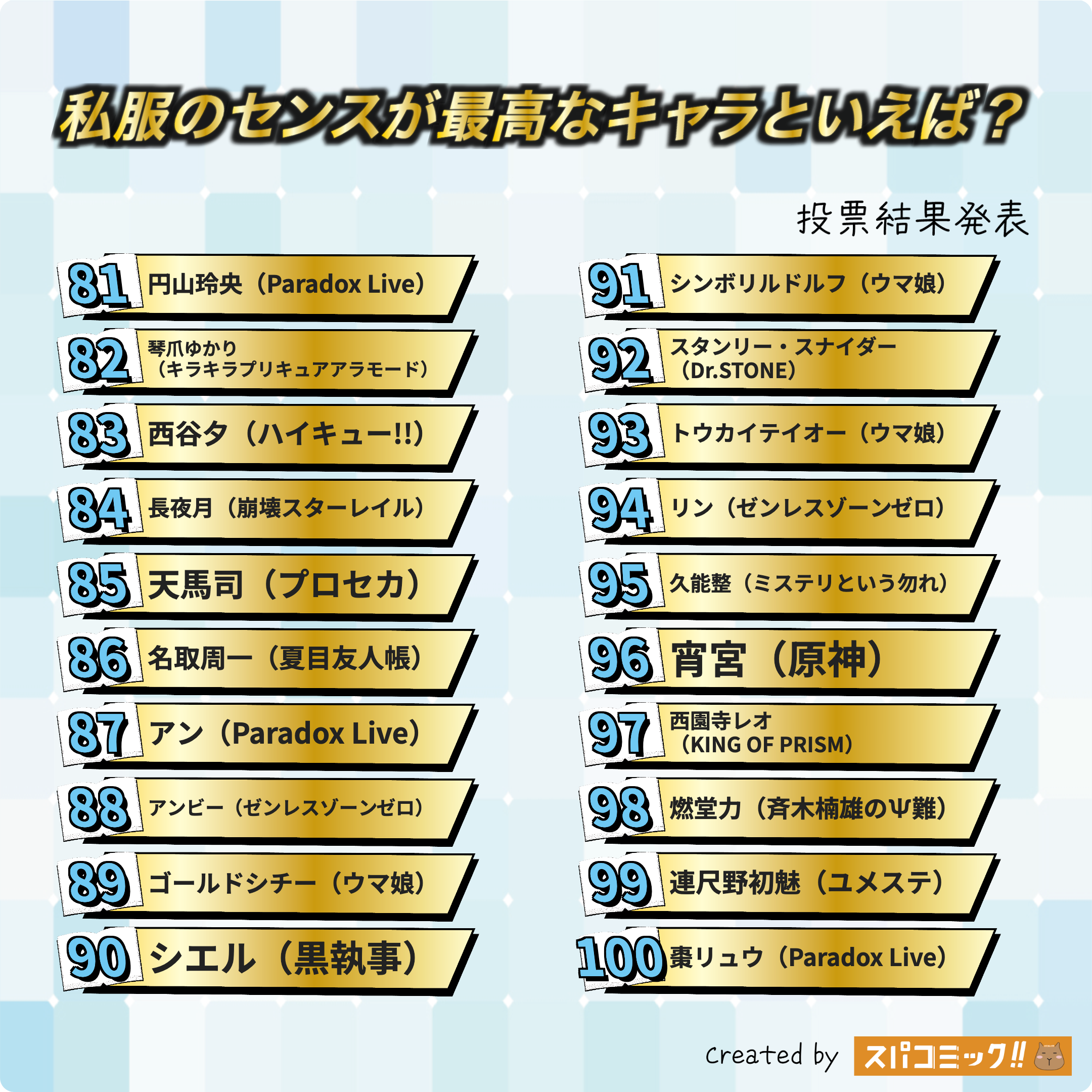 フォロワー様からいただいたお題「私服のセンスが最高なキャラといえば?」で投票を実施しました。投票いただいた148種類のキャラの中から上位TOP100をご紹介します。著作権の都合上、イメージ画像と合致していない場合があります。