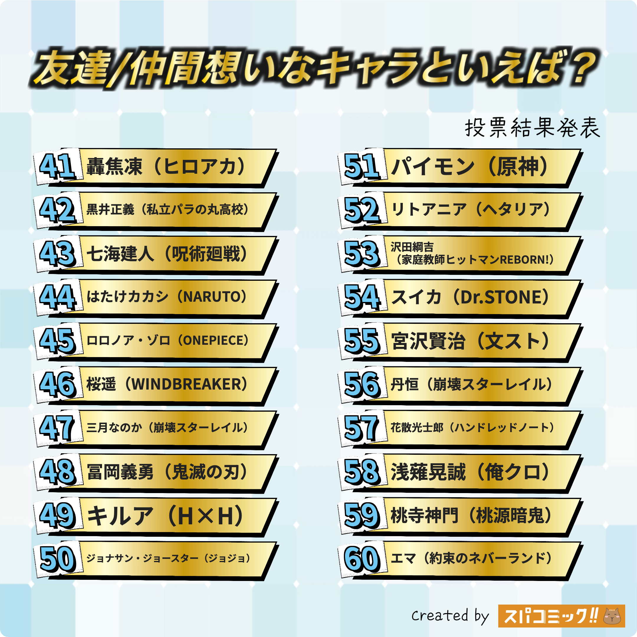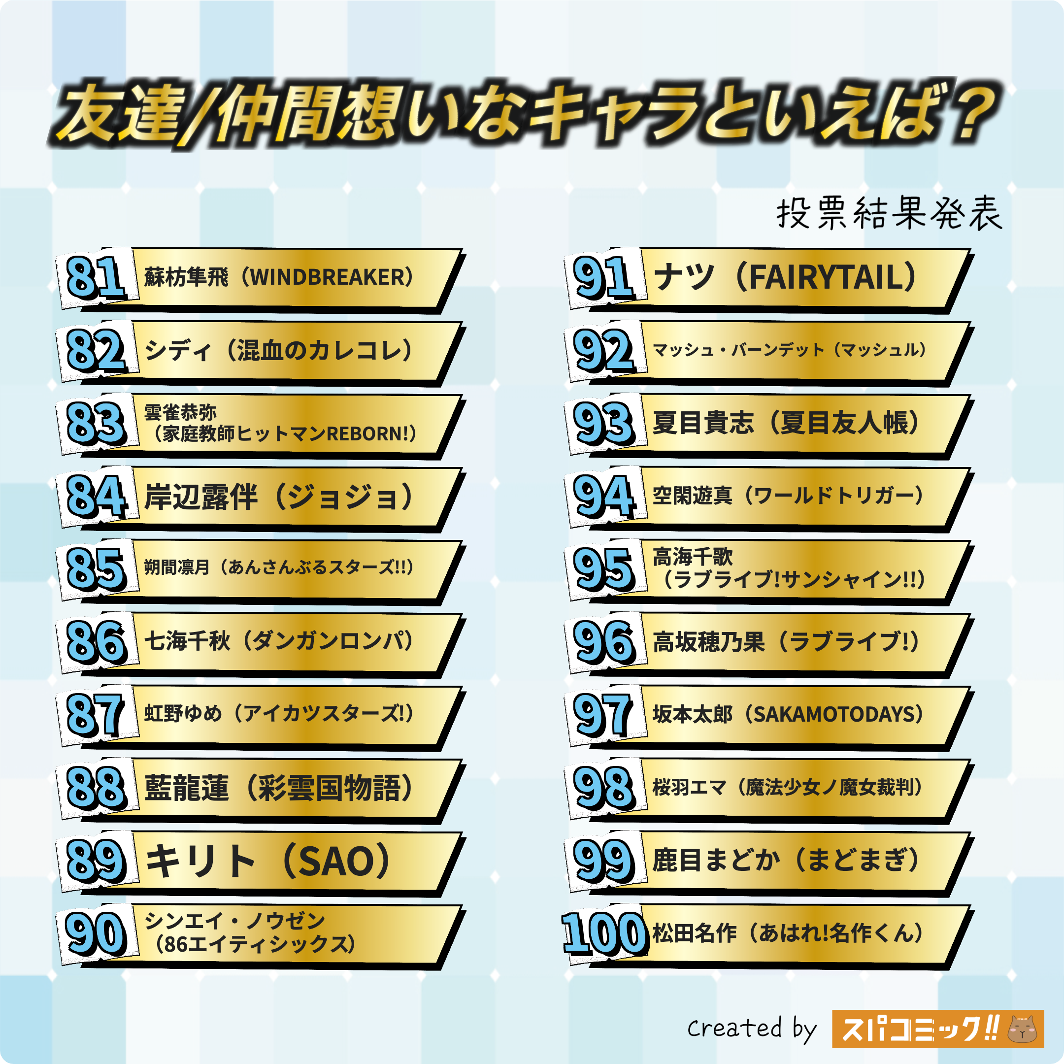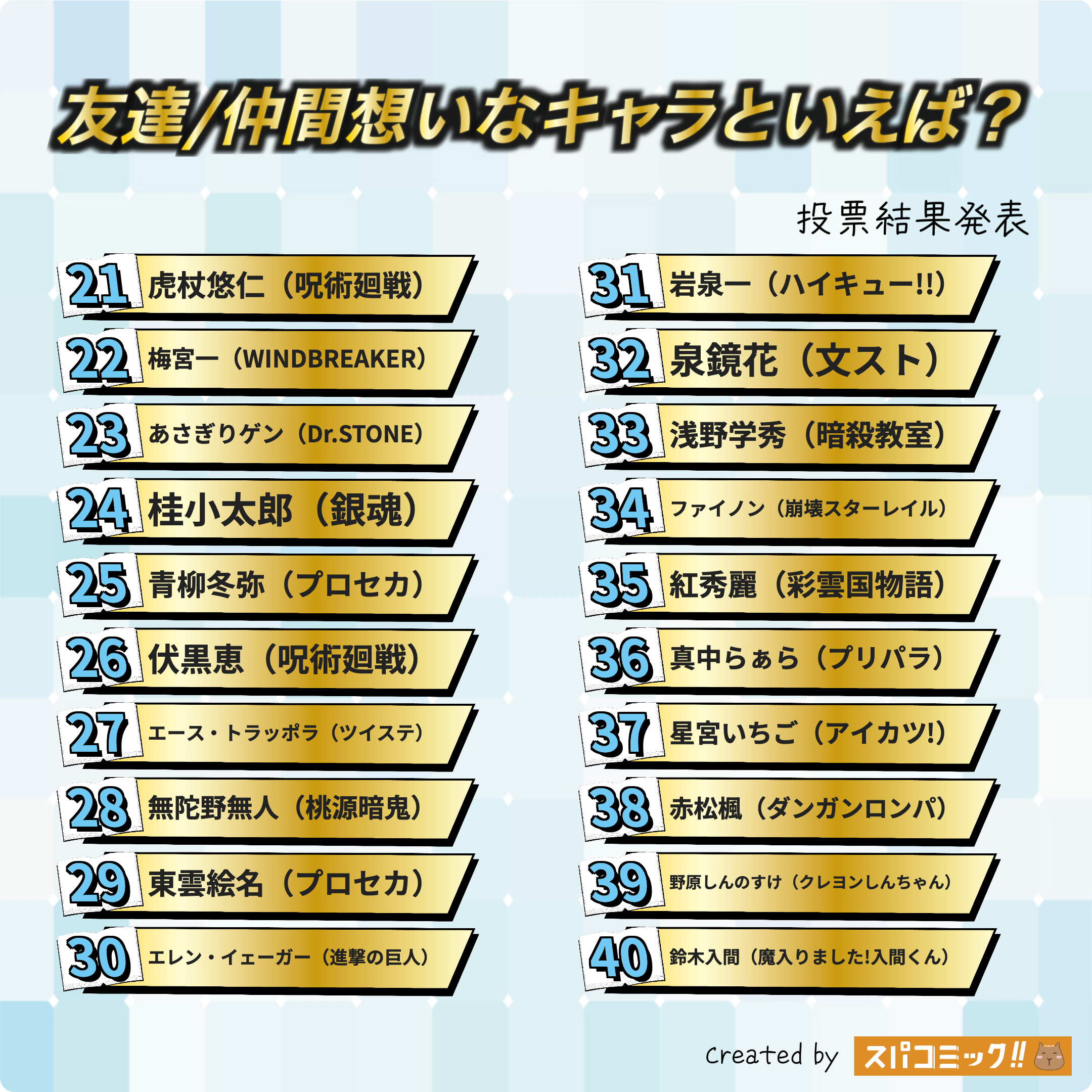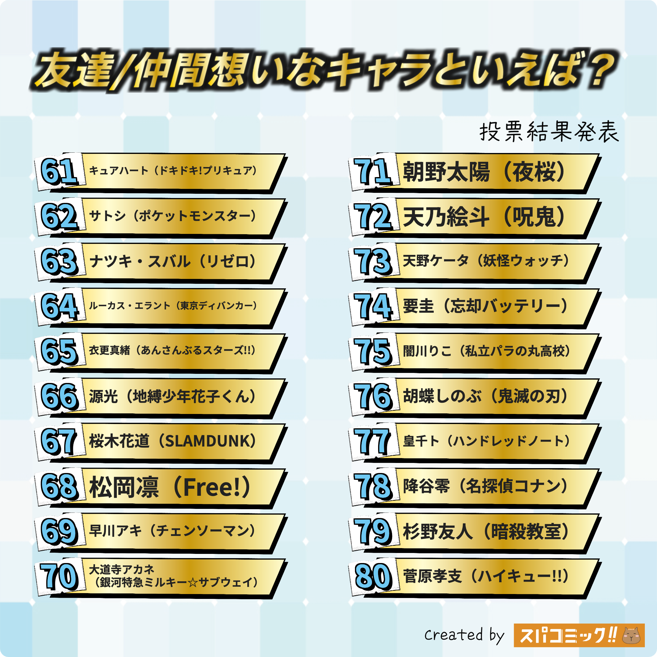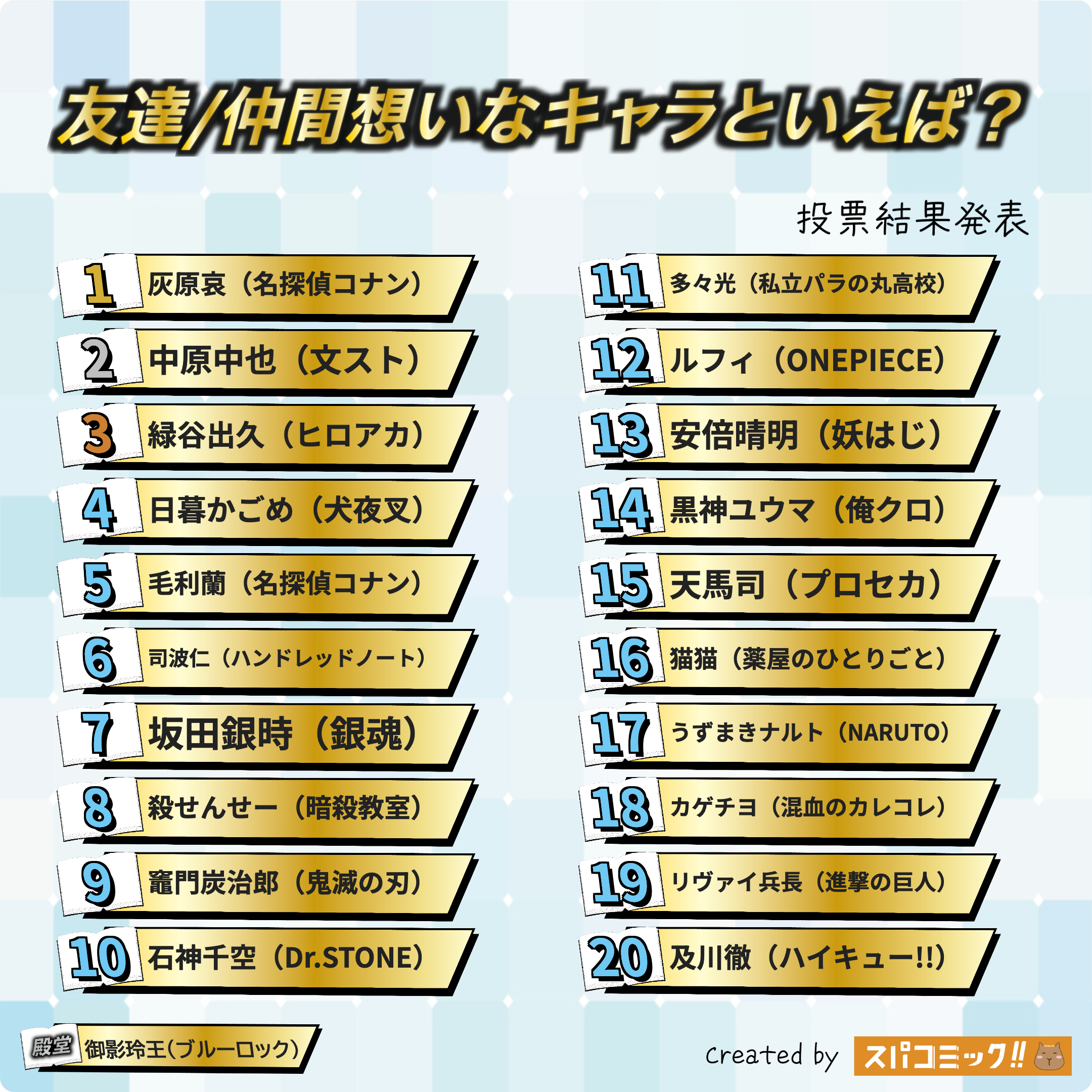 8票- 大切な仲間のために思い悩んだり、どんなときも周りを優先できる司はまさに仲間想いという言葉がよく似合う人だと思う。