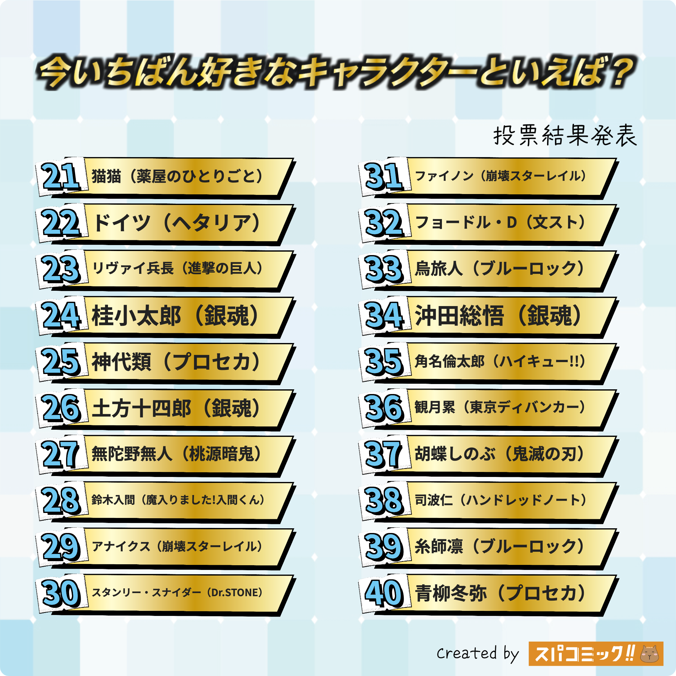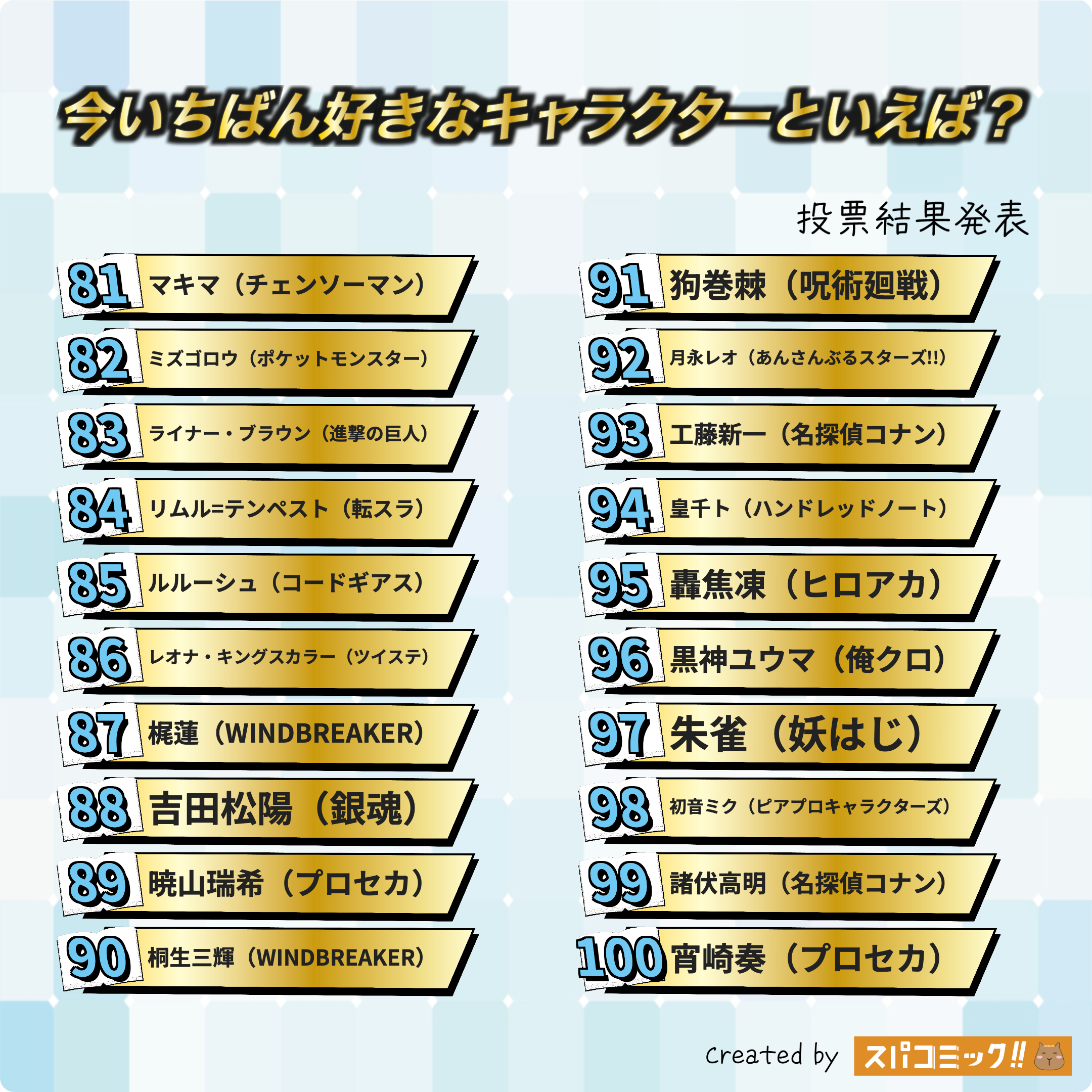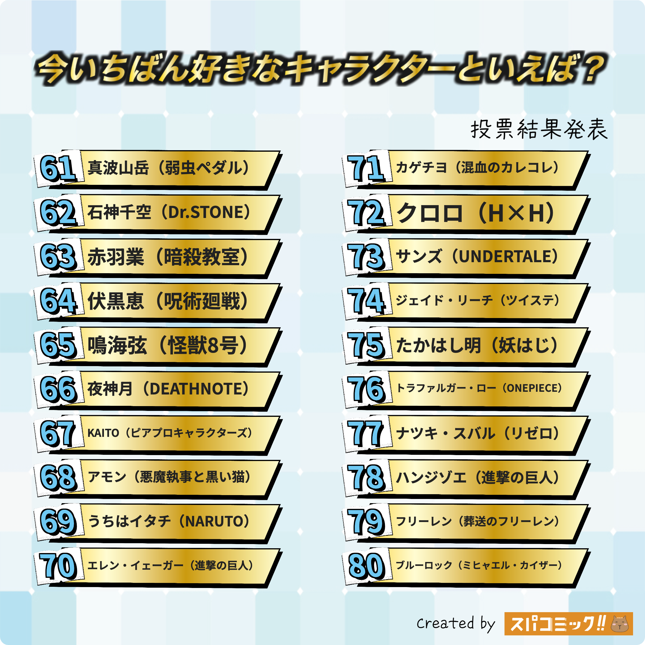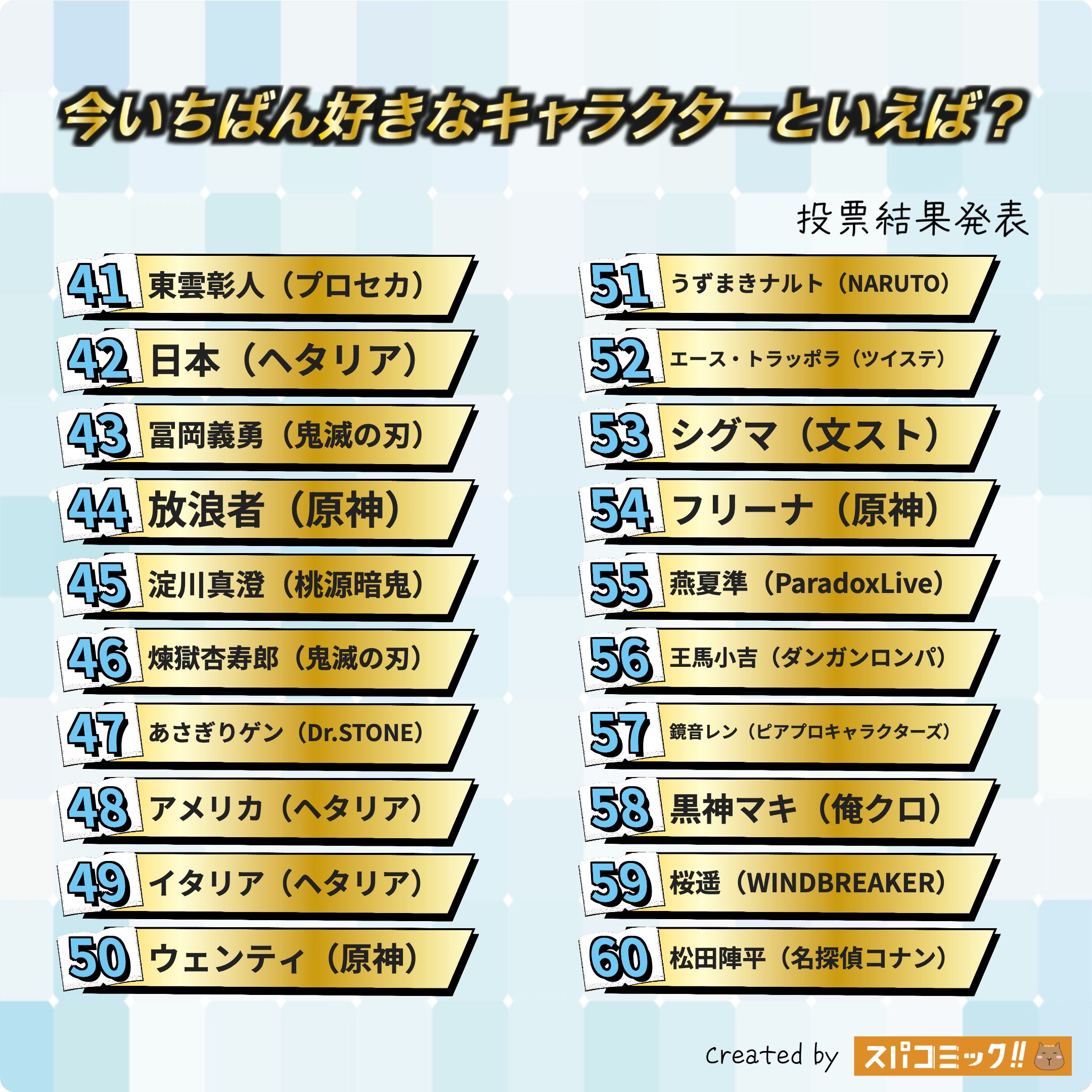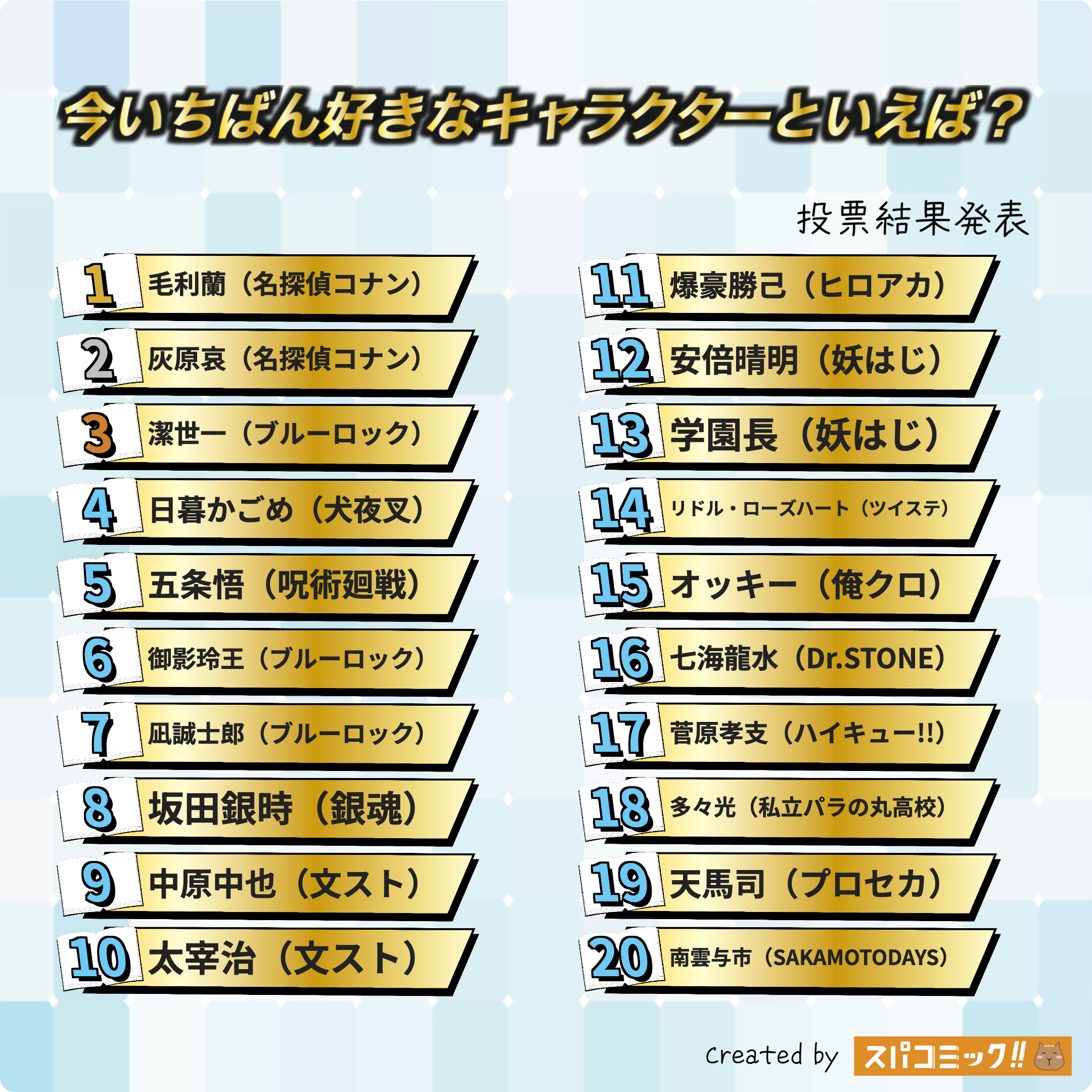 6票- 今までの人生で1番愛しているキャラです。優しい所もかっこいい所も可愛い所も初期の爽やかな所も途中からの様子のおかしい所もダジャレを言う所も勝つためには自分じゃなくて後輩をレギュラーにしてと言う所も後輩思いのところも全てが大好きです。これまでもこれからも一番の推しです。