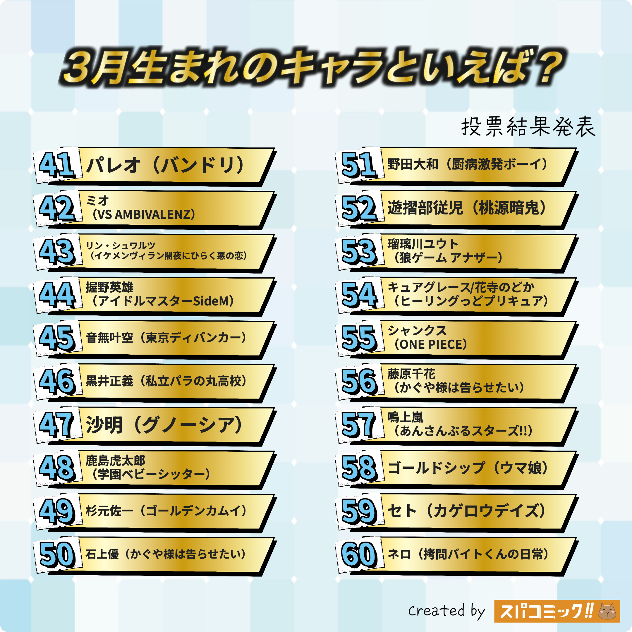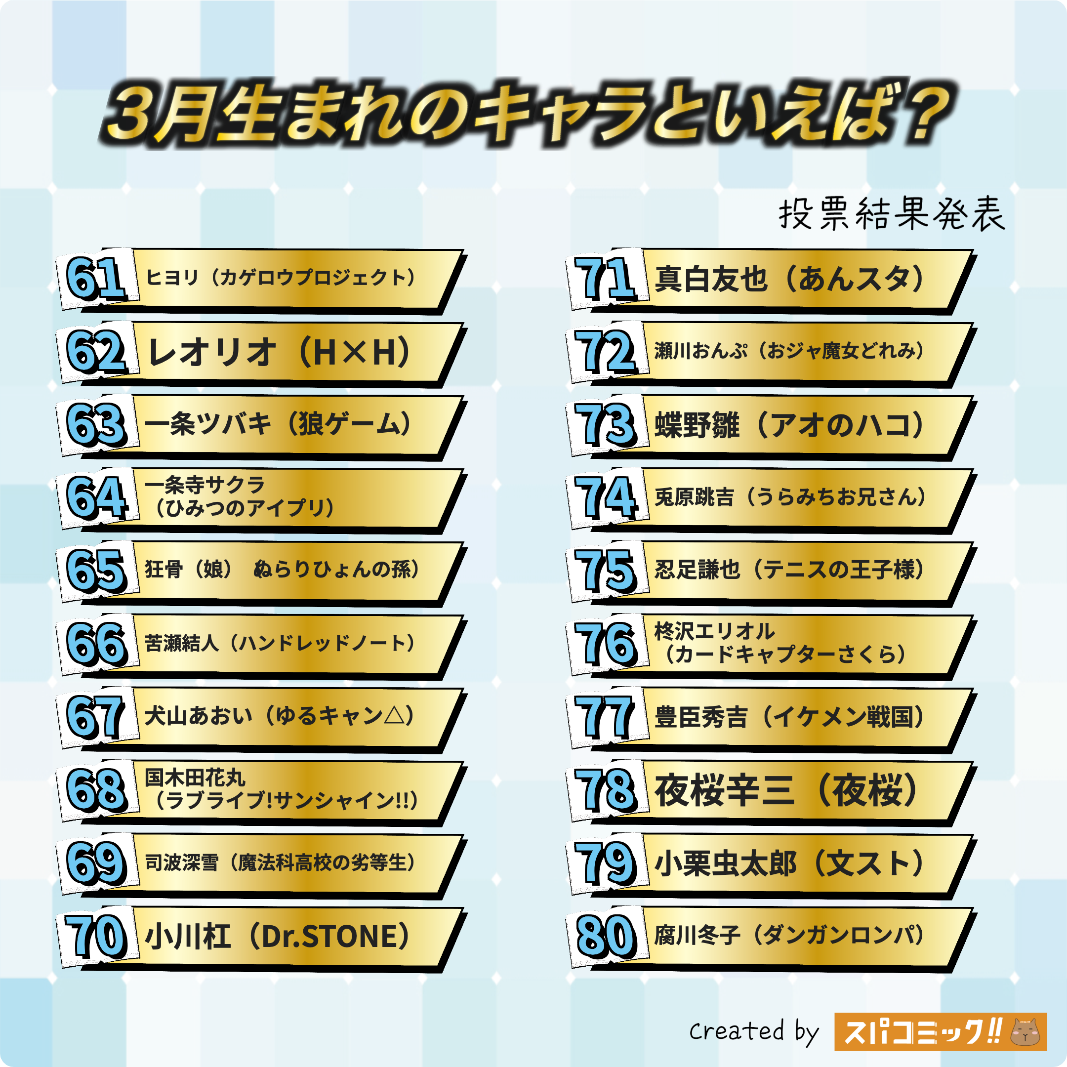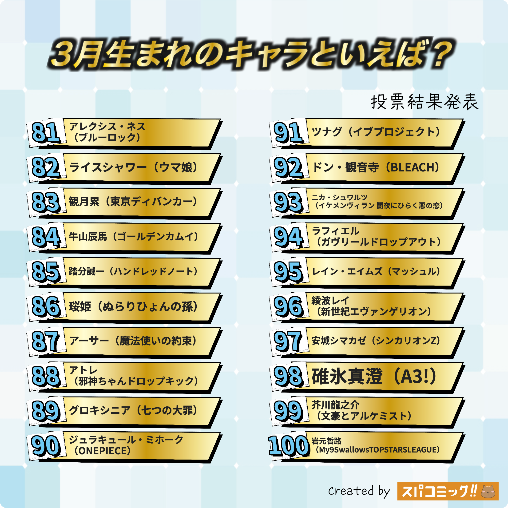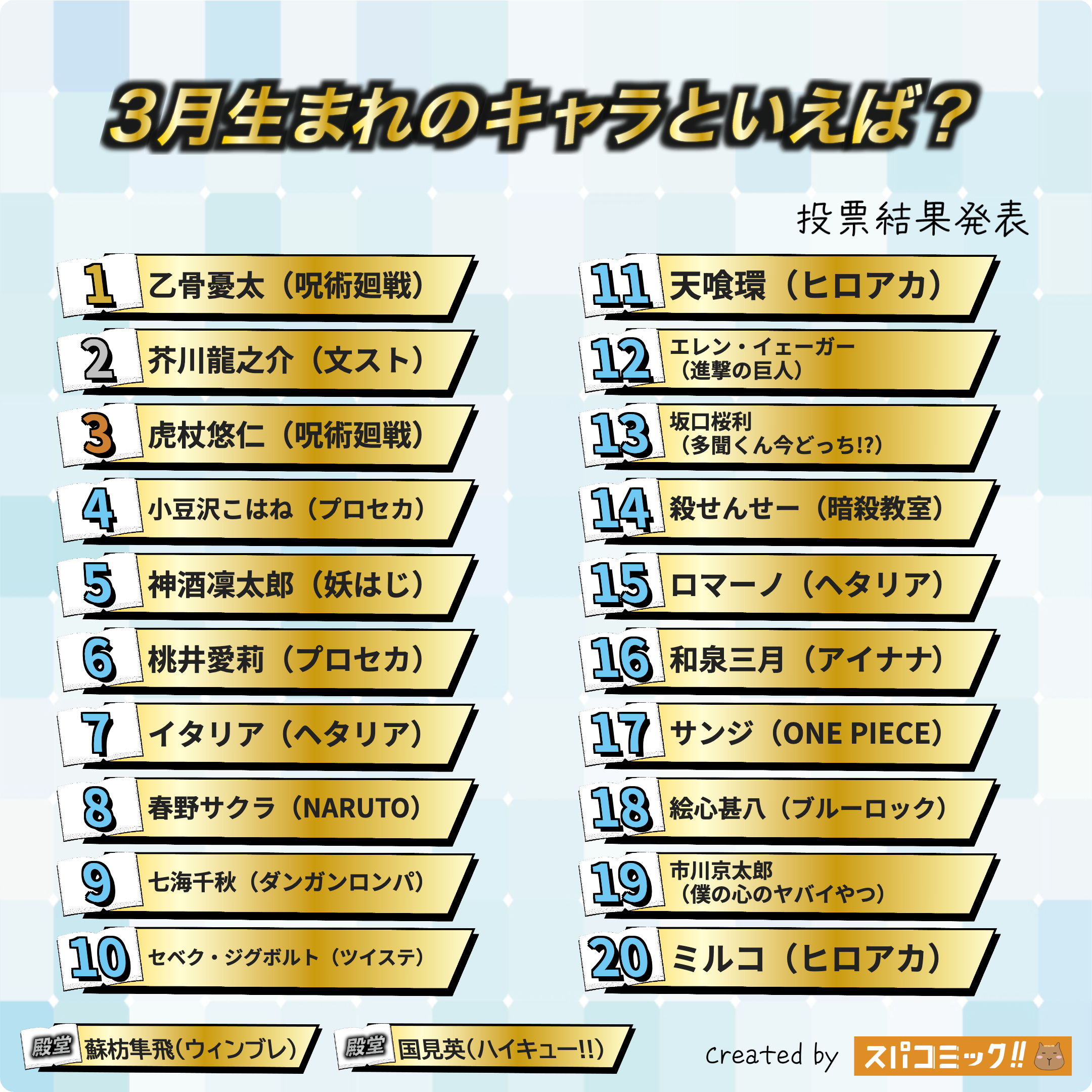 発表数: Best100+殿堂入り2キャラ