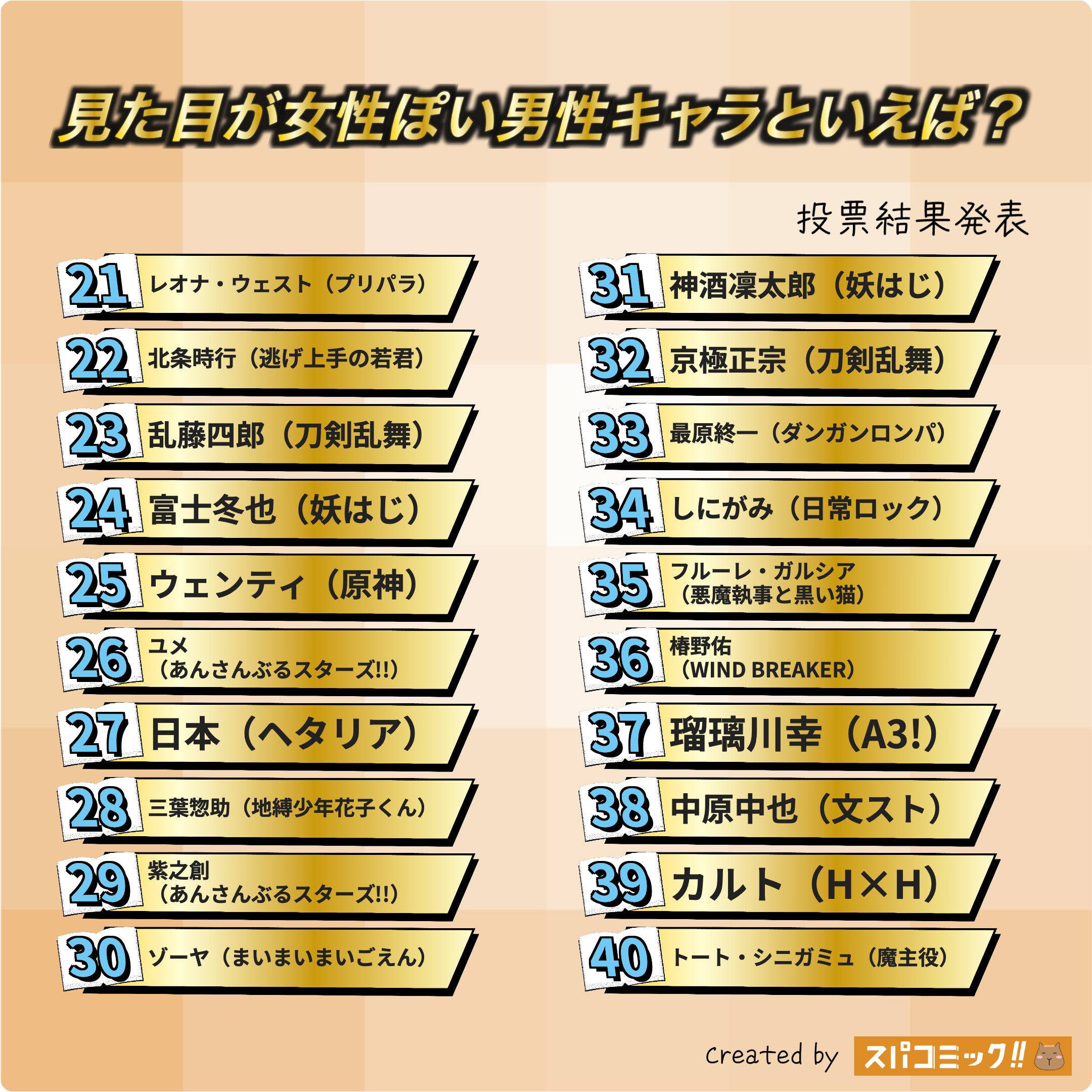 12票- 女装回のとき1人だけ違和感なさすぎた…公式にもすれ違う人のほとんどが振り返るほどの容姿ってなってたし